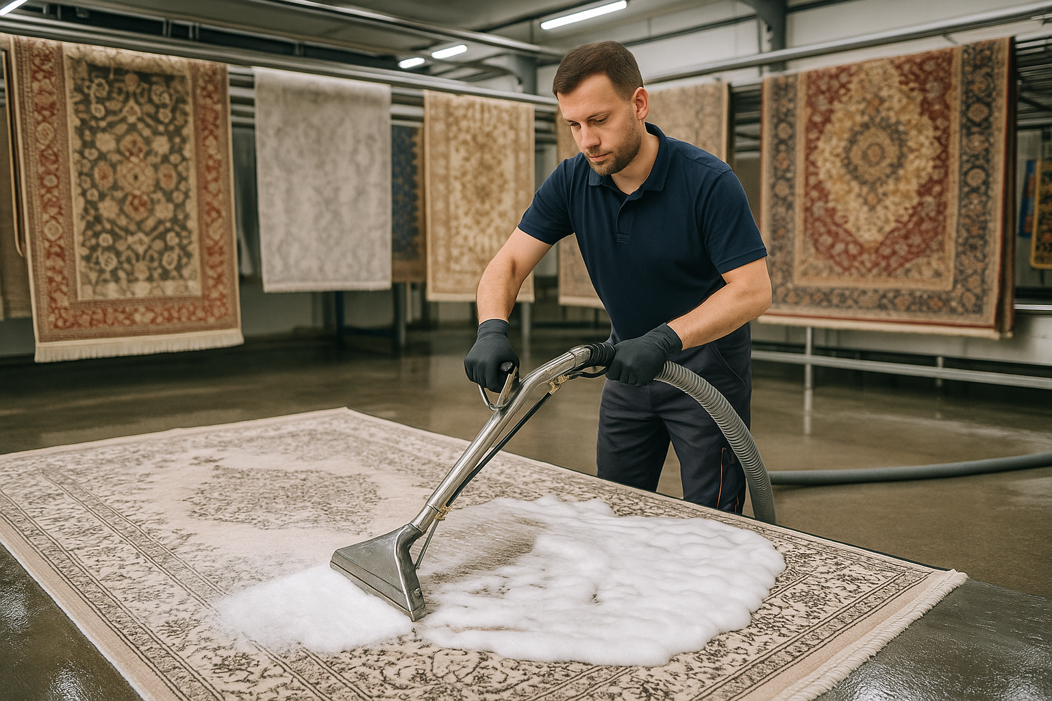 Yıkama sırasında halının üzerindeki inatçı lekeler özel çözücüler ile dikkatlice çıkarılır. Fırçalama işlemi halının dokusuna göre ayarlanır; yün halılar için yumuşak fırçalar kullanılırken makine halıları için daha detaylı temizlik uygulanır. Durulama aşamasında halı tamamen köpükten arındırılır ve sıkma makineleri ile hızlı şekilde nemi alınır.